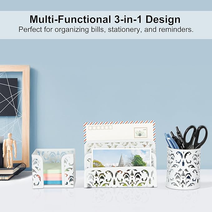 - 3 in 1 Office Supplies for Desk: The desk accessories set includes 1x mail organizer, 1x pencil holder and 1x sticky notepad holder. Our office supplies for desk is a great gift for holiday Christmas gifts, birthday gifts, party gifts, back to school gifts.
