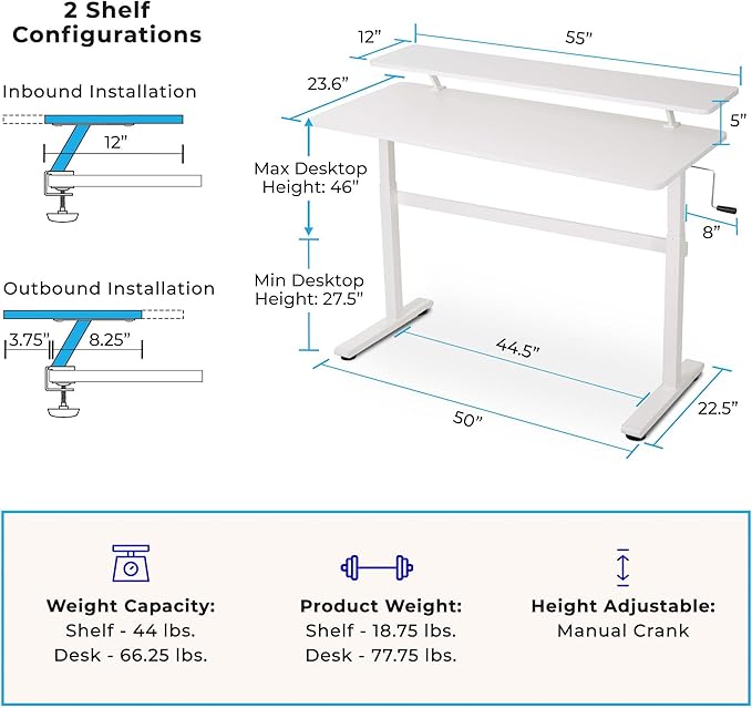 - CRANK HEIGHT ADJUSTMENTS: Say goodbye to the pain and stiffness that comes from sitting all day. This stand-up desk seamlessly transitions from sitting to standing height with an easy-turn crank that can be inserted on either side of the desk