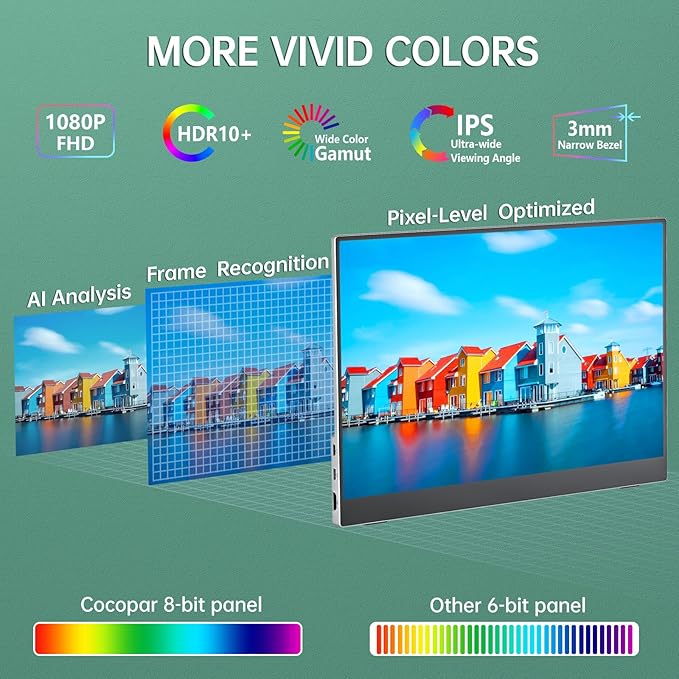- 1080P HDR Monitor: 15.6 inch 1920x1080 Super Clear IPS A-grade screen. 1080p resolution, 178° FULL viewing angle, wide color gamut, FreeSync, HDR, Low Blue Light features. Born to deliver you stunning visuals with awesome color reproduction