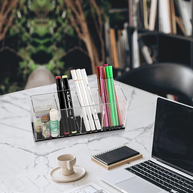 Acrylic Clear Pencil Holder Pen Holder 4 Compartments,Brush Holder Countertop Desk Organizers and Storage for Pen,Pencil,Desk Accessories,Makeup Brush,Stationary and Art Supplies(Assembly Required)