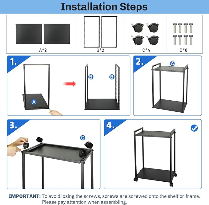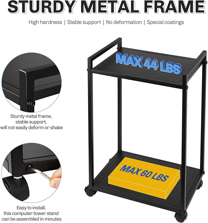 - 2 Tier PC Tower Stand: Our CPU holder adopts a two-layer design concept. The bottom layer stores the host computer, and the upper layer can store office supplies such as printers, potted plants, magazines, and can also be used as a mobile luggage cart.