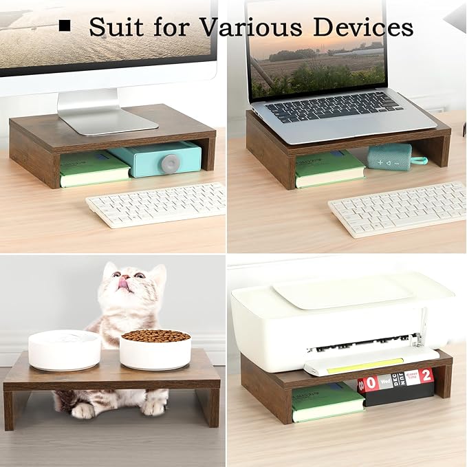 - 【2 Height Adjustable】 [3 3/8’’ & 6 3/4’’] Ergonomic design. When used side by side, the height is 3 3/8’’, which can place two monitors. When stacked up and down,be a 2 tier monitor riser which height is 6 3/4’’, and it is fixed with wooden pins avoid shaking.