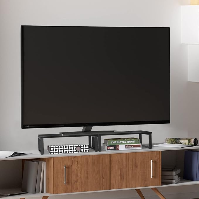 - PERFECT STORAGE RACK SIZE - The single monitor stand shelf is 15.75 inches long and the two are 31.5 inches long, easily accommodating 2 monitors or laptops; Monitor holder rack stacking, increase desktop space; Parallel dimensions can support a large TV.