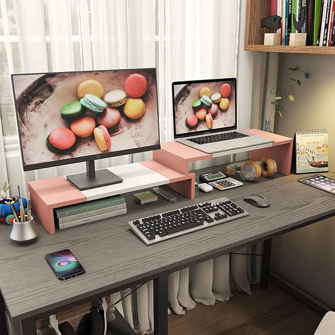 - Dual Monitor Riser :Freely adjust length and angle,the length of computer stand can be adjusted from 18.9 inch to 38.4inch,It can be used at both L desk and regular tables. The adjustable height and Angle gives you a comfortable office experience.