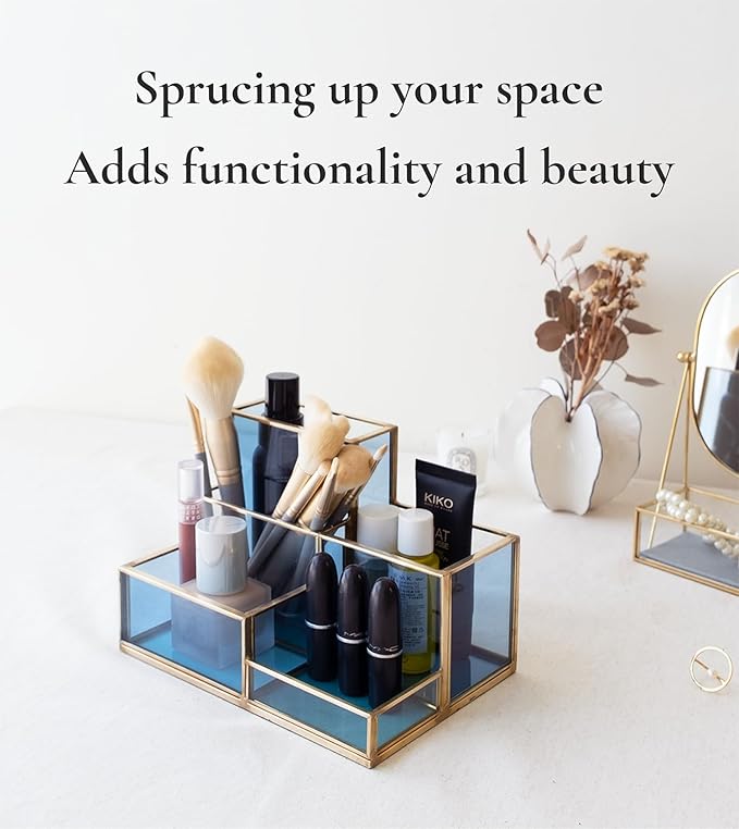 FONDAZZA 5-Compartment Desk Organizer for Home Office Supplies, Gold Brass with Blue Glass, Workspace Storage for Stationery, Cosmetic, Makeup Tools and Brush.