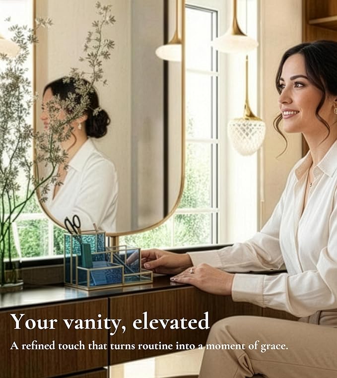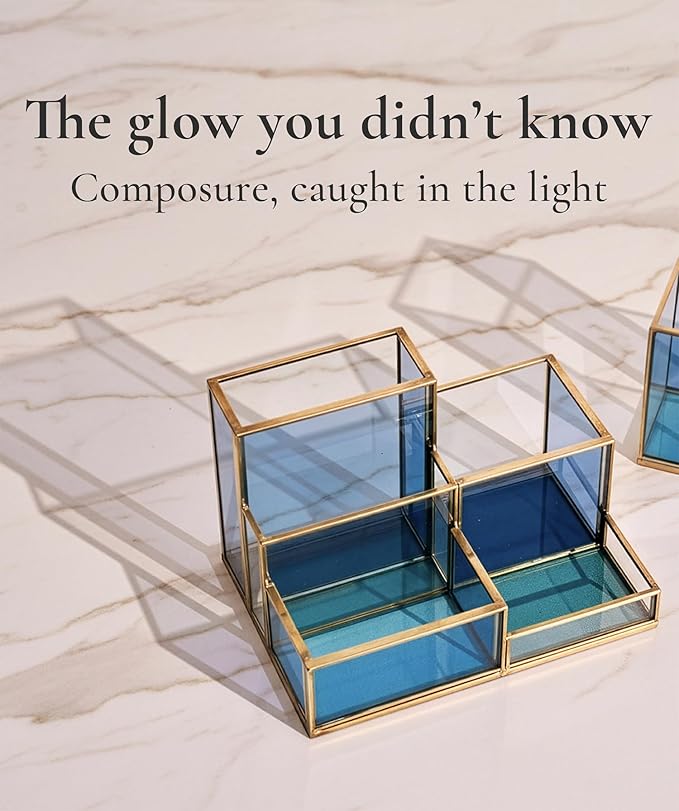 - COLORFUL YET MODERN : A Desk Organizer in simple geometric shape with premium gold brass and sleek blue glass to create a stunning colorful light-reflection as a perfect eye-catchy piece on your desk or table.