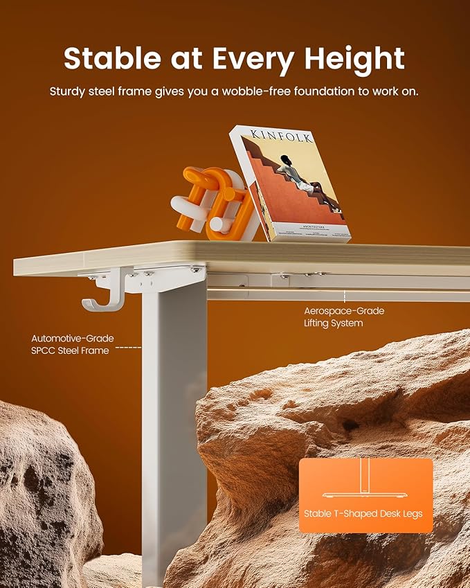 - Outstanding Stability: This electric standing desk has a sturdy solid steel frame with aerospace-grade lifting column connectors (still stable & secure after testing 100,026 times). It's a firm foundation for work, even at full height