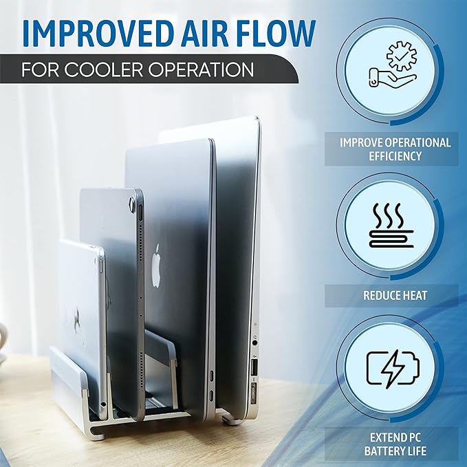 - Modern Design & Laptop Holder: Elevate your workspace experience with this high grade aluminum finish vertical laptop holder; cradle and hold your laptop, MacBooks, or mobile devices in style, while reclaiming 80% of your desk space.. This laptop holder vertical saves valuable desk space, protects your device from spills, provides better cooling and 360- degree airflow with this premium vertical laptop holder.