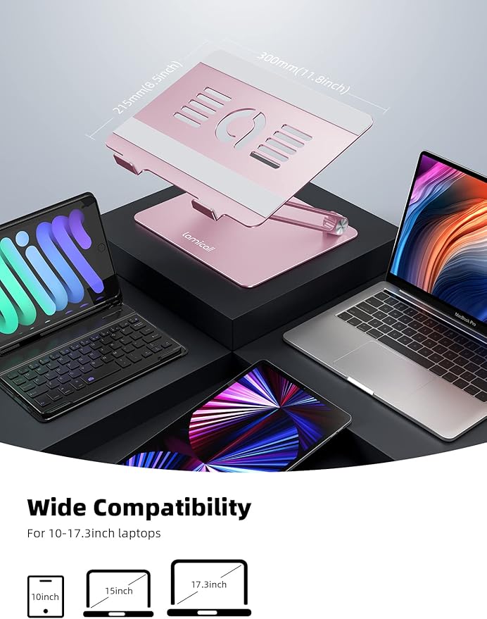 - Wide Compatibility: The laptop stand for desk is compatible with all laptops from 10" up to 17.3", including popular models like MacBook, MacBook Air, MacBook Pro, Surface Laptop, Dell XPS, Google Pixelbook, HP, ASUS, Acer, Chromebook, Alienware, etc.