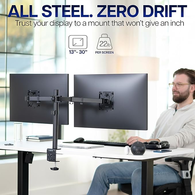 - Fits 13" to 32" Screens: Dual monitor mount fitting two screens 13” to 32” in size and up to 22 lbs in weight each with VESA 75x75mm or 100x100mm backside mounting holes