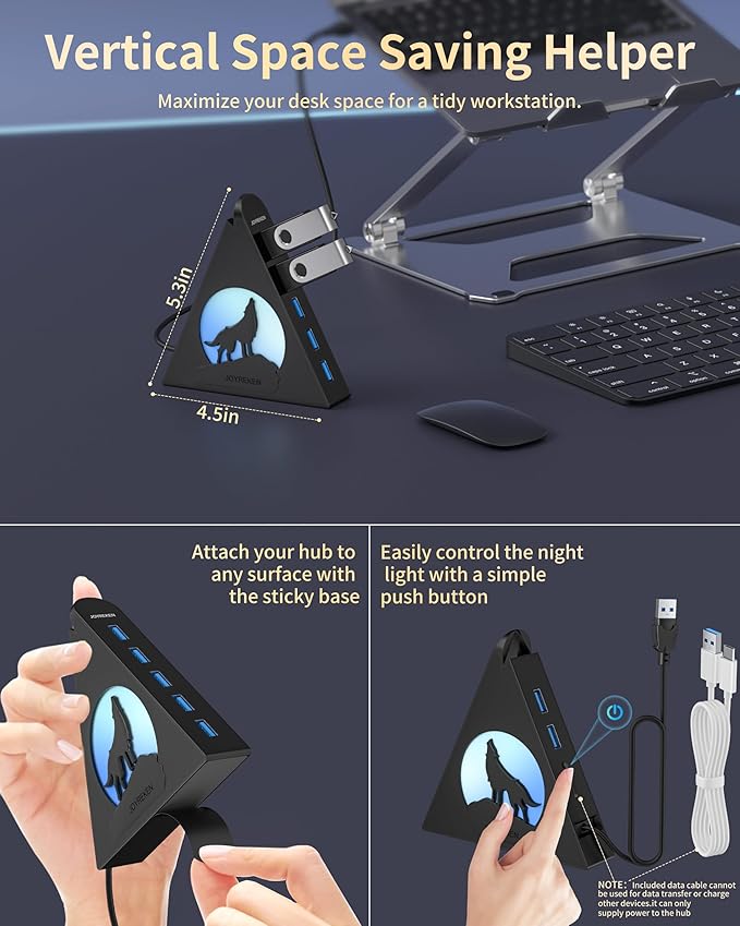 - 【RGB Lighting with Unique Triangular Design】Note: Please push the button once to turn on/off the night light on the side.Bring energy to your workspace with this stylish rgb usb hub, featuring a vivid wolf-head pattern that cycles through 7 colors. Its triangular, modern form fits perfectly into any desktop usb hub layout while also doubling as a visual centerpiece. The vertical design helps conserve desk space—making it a standout usb hub tower for users who want flair with function. It also includes double-sided adhesive so you can mount it wherever works best.