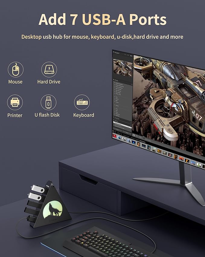 - 【2FT Flexible Extension Cable】The included 2FT cable gives you freedom to place the hub exactly where you need it—on a monitor stand, laptop dock, or under your desk. Designed for convenience, this usb hub for desktop includes a reusable cable tie to keep things neat and clean. It’s an ideal fit for both home and office environments where flexible positioning of a desktop usb hub is a must.