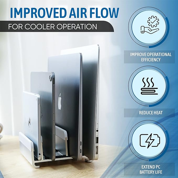 - Modern Design & Laptop Holder: Elevate your workspace experience with this high grade aluminum finish vertical laptop holder; cradle and hold your laptop, MacBooks, or mobile devices in style, while reclaiming 80% of your desk space. This laptop holder vertical saves valuable desk space, protects your device from spills, provides better cooling and 360- degree airflow with this premium vertical laptop holder.