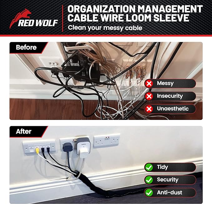- Split design allows cables to branch out from anywhere; It can be cut to any desired length; Make cables look professional and eliminates clutter; Open the cable covers and put in the wires, and the self-wrap cable sheath will close on itself