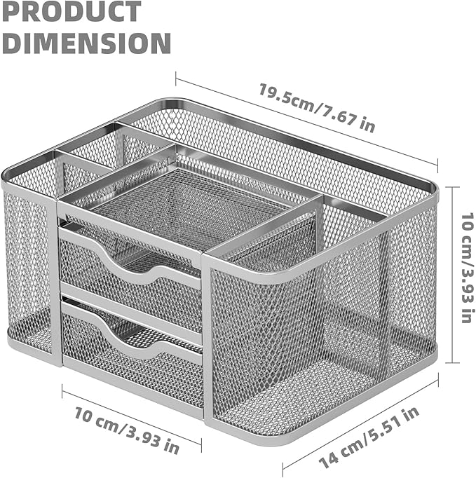 Marbrasse Mesh Desk Organizer, Pen Organizer with 2 Drawer, Multi-Functional Pencil Holder, Desk Organizers and Accessories with 5 Compartments + Drawer for Office Art Supplies (Silver)