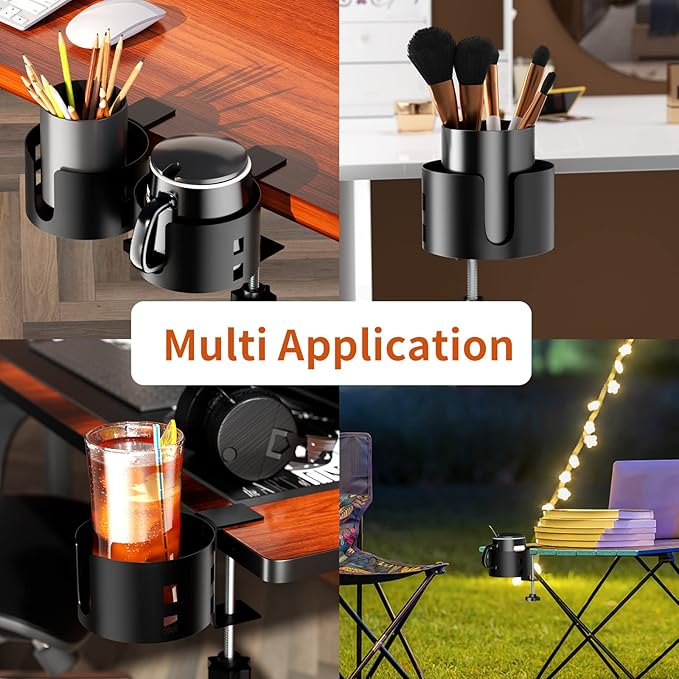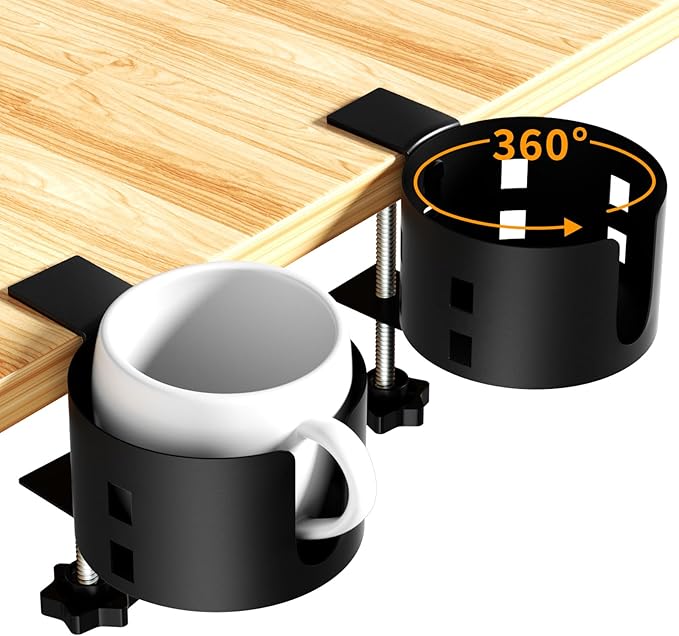 - 【No Drill Needed & Protect Your Desk】 The cup holder with five installation buckles and a clamp mount helps easily install and remove. Simply tighten the black knob downward by hand instead of drilling a hole or paste with glue to the underside of your desk, so leave no damage to your desk. The protective pads between the clips are perfect for preventing scratches on your table and stabilizing the cup holder.