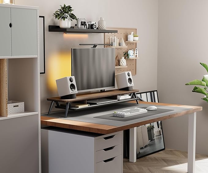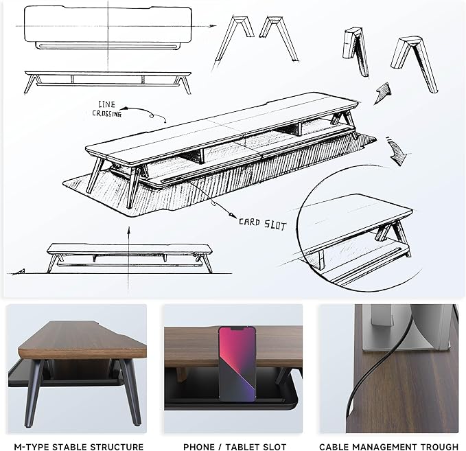 - 【2 TIER DESKTOP ORGANIZER】At longest 42.5inch wide,longer size with more space. This laptop riser is big enough to support two monitors. It has 1 universal device holder slot and 3 high capacity compartments. You can easily store your office accessories & supplies under your monitor stand to keep your desktop tidy. Our monitor stand rise comes with cable management slots that can make your cord stay organized.