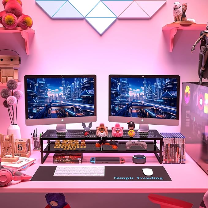 Simple Trending 2 Tier Metal Dual Monitor Stand Riser,Computer Office Desktop Organizer for 2 Monitors With 32"x10" Mouse Pad ,for Laptop,Printer,TV,Black
