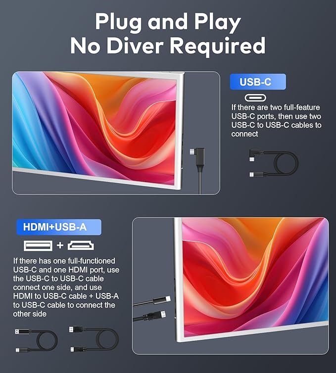 - 【Compatibility & Connectivity】- Our portable monitor seamlessly supports Windows, MacOS, Switch, Android & Xbox, enabling efficient multitasking with USB-C cables supporting dual displays (If your system has output power is 10V or above), multiple USB ports with HDMI connectivity. Enjoy easy plug-and-play connectivity between your laptop and dual screen monitor extender without the need of any driver installation