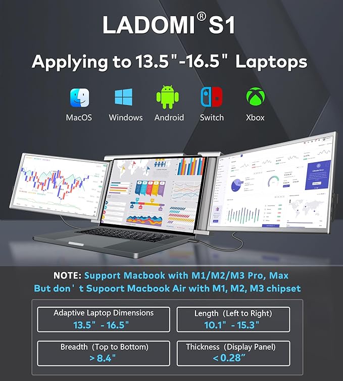 - 【PRE-PURCHASE NOTICE】- Ladomi Laptop Screen Extender are supported only for Macbook with M1 Pro & Max//M2 Pro & Max/M3 Pro & Max chips and the full M4 chip series. 1. When buying our portable monitor, verify that your laptop has either 2 Type-C ports or one Type-C and at least a single HDMI port. 2. If it displays "No Signal" after connecting, it means your Type C only for power supply, You have to use a combination of HDMI + USB-A cables. 3. HDMI port needs a separate power adapter (5V/2A or above)