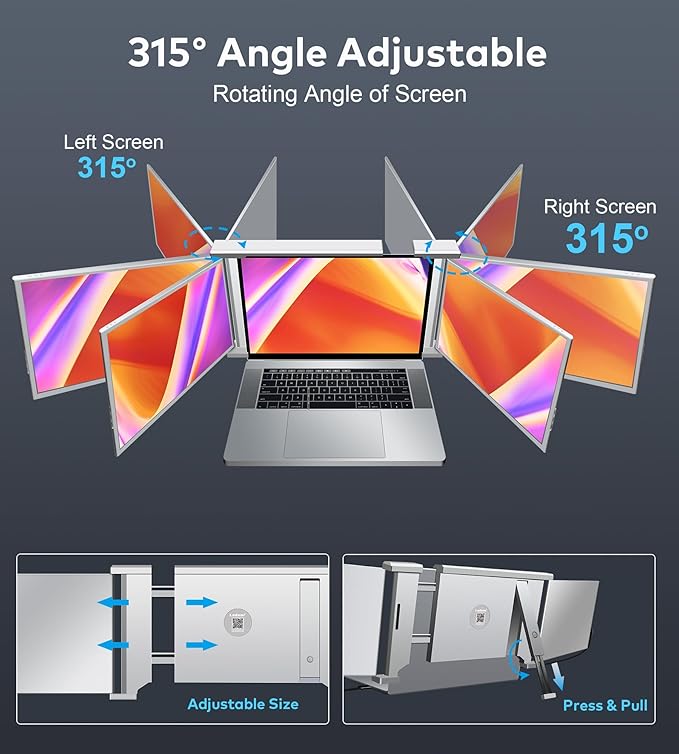 - 【Easy to Use & Multi-purpose】- This laptop screen extender provides easy activation. Effortlessly unfold the unique adjustable stand and expandable brackets to set up your workspace. The triple portable monitor is perfect for wide applications and a choice of editing, designing, gaming, stock operations, and online shopping