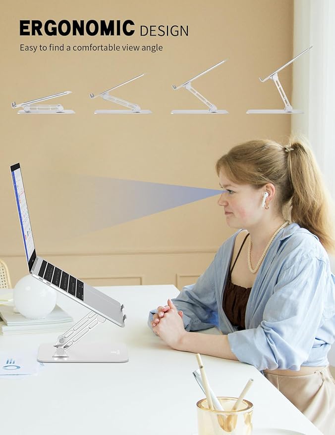 - ERGONOMIC DESIGN:The ergonomic laptop holder adjusts from 0° to 90°, accommodating various users. It improves posture, alleviating back pain, neck stiffness, wrist discomfort, and eye strain. Our laptop riser reduces eye and neck pressure while promoting optimal posture