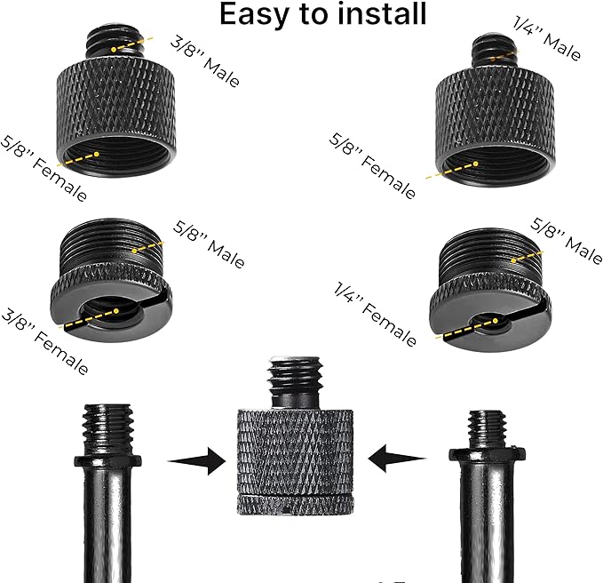 - 4 Male And 4 Female Adapters: Each microphone adapter set comes with 3/8 female to 5/8 male, 5/8 female to 3/8 male, 1/4 female to 5/8 male, and 5/8 female to 1/4 male screw thread adapters that provide a suitable fit for most mic stands the simple way
