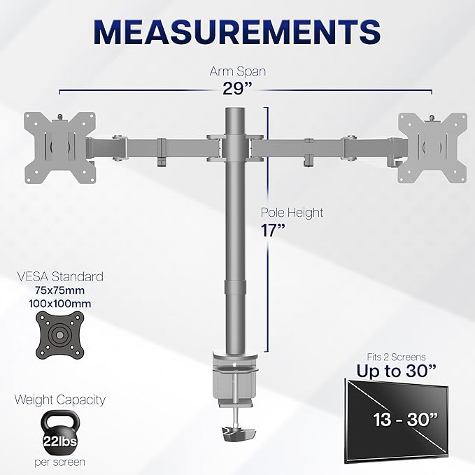 - Fits 13" to 30" Screens: Dual monitor mount fitting two screens 13” to 30” in size and up to 22 lbs in weight each with VESA 75x75mm or 100x100mm backside mounting holes