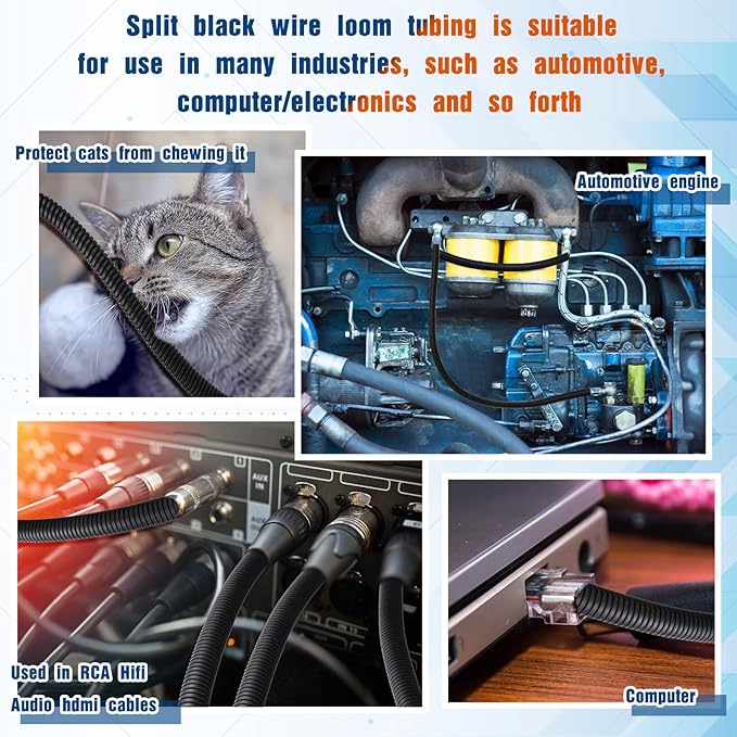 - Wide Range of Application: this wire loom tubing is flexible and versatile, and it can be applied for general purpose applications in home, office, automotive, and industrial wiring; It's ideal for organizing and protecting power cables, entertainment system wiring, fiber optic cables, other types of cables, wire harnesses, small hoses, and tubes