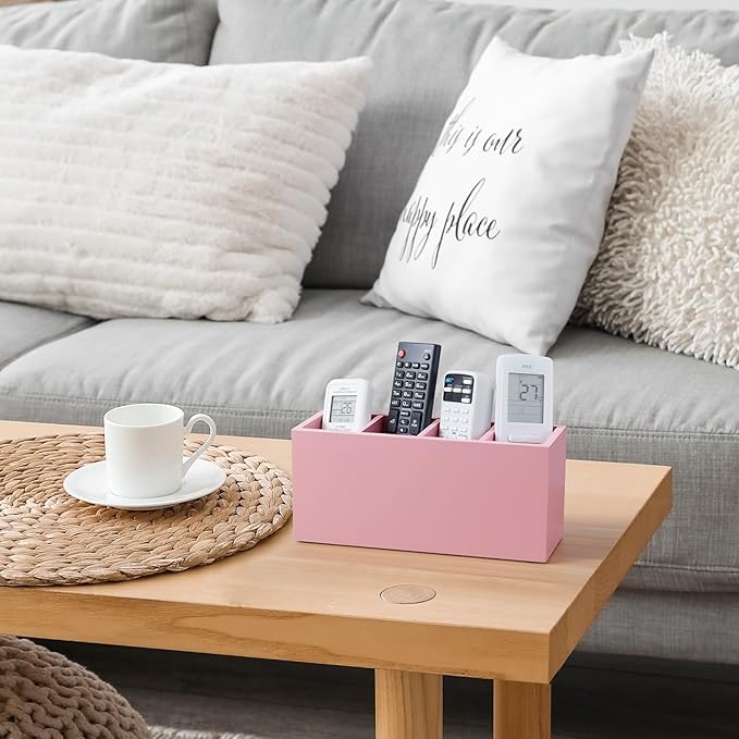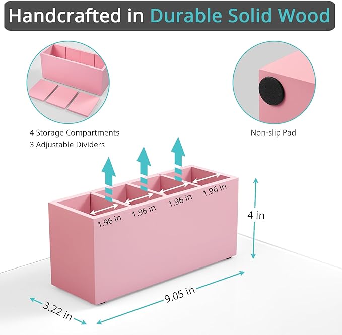Bivvclaz Pencil Pen Holder for Desk, Wooden Office Desk Organizers and Accessories with 4 Slots for Countertop, Makeup Brush Holder Organizer for Bathroom Vanity, Silverware Caddy for Party, Pink