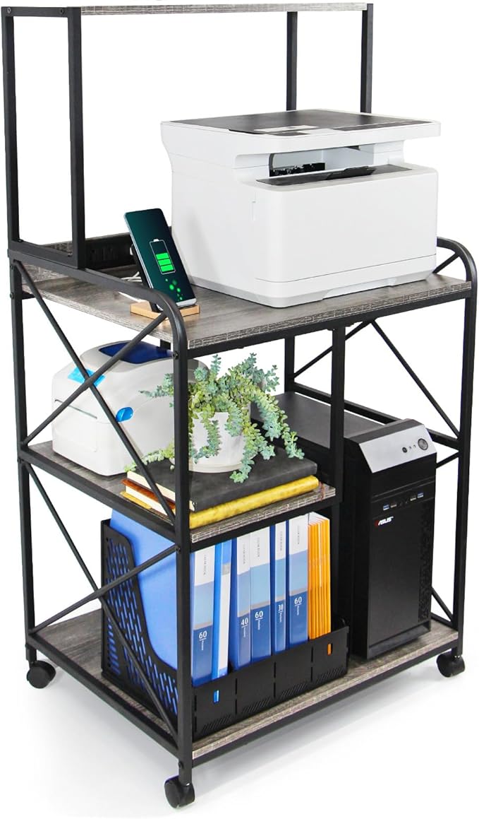 - 【Multipurpose Rolling Printer Cart】The printer stand includes rolling casters, 2 of the 4 wheels are lockable to keep the cart in position. So you can either move the stand around flexibly or keep the stand stationary with lockable wheels. This printer cart is not just for holding printers, but also serves as a file cabinet, office storage rack, paper shredder stand, microwave oven stand, kitchen baker's rack, and file rack organizer. Perfectly for organizing your office or living space.