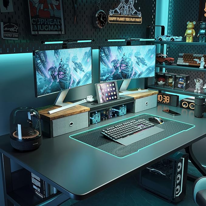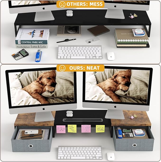 - 【Spacious Storage Solution】The dual monitor stand features two practical slide-out drawers, which offer ample storage space for office supplies and accessories. Protect your private items and make your desk more functional and organized. Enhance your work efficiency.