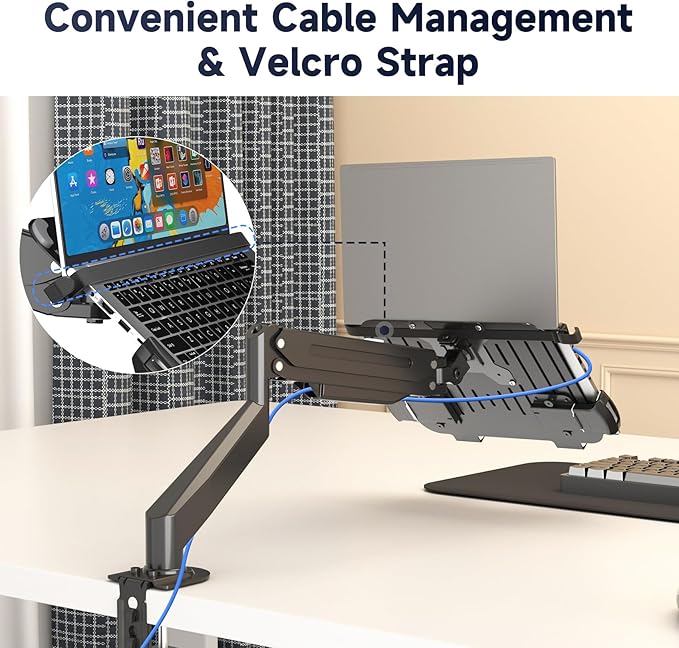 - Secure Laptop Mount:The laptop stand is designed with adjustable clamps to fit laptops from 13 to 18 inches. The included cable tie hold the laptop completely in place, ensuring that it won't fall out of the stand. Rubber pads keep your device safe from scratches.