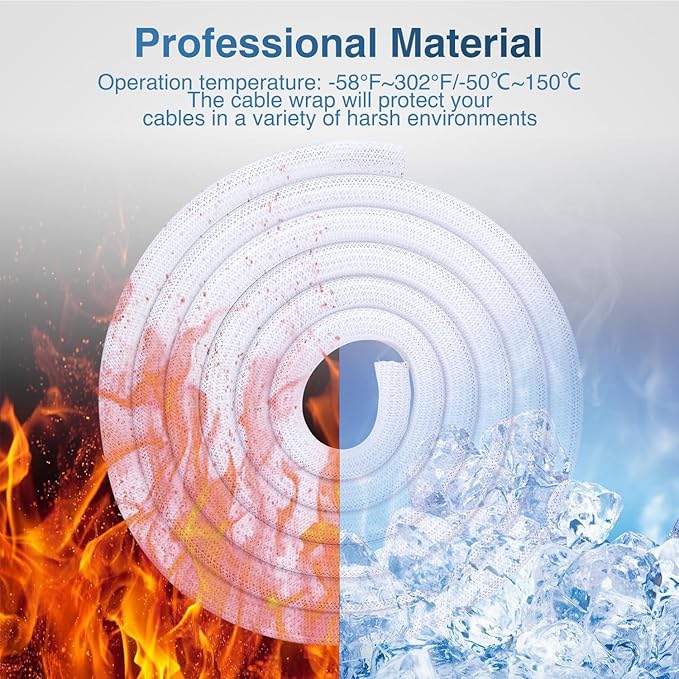 - High-Temperature Resistance: Made of professional polyester material, the sleeving provides excellent heat dissipation performance and high-temperature resistance. The operation temperature range of the sleeving is -50℃~150℃, which can withstand extreme weather conditions, and greatly extend the lifespan of electrical wires