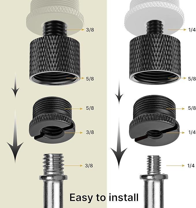 - 4 Male And 4 Female Adapters: Each microphone adapter set comes with 3/8 female to 5/8 male, 5/8 female to 3/8 male, 1/4 female to 5/8 male, and 5/8 female to 1/4 male screw thread adapters that provide a suitable fit for most mic stands the simple way