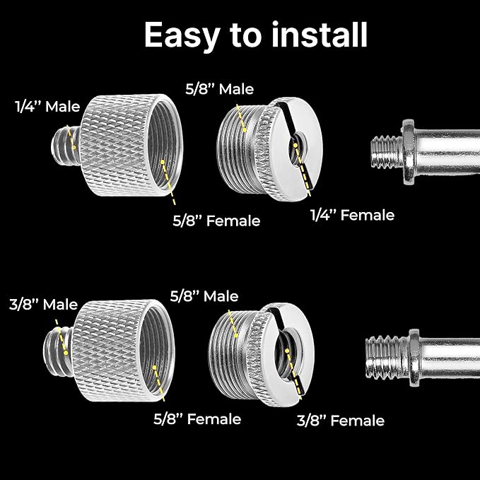- 4 Male And 4 Female Adapters: Each microphone adapter set comes with 3/8 female to 5/8 male, 5/8 female to 3/8 male, 1/4 female to 5/8 male, and 5/8 female to 1/4 male screw thread adapters that provide a suitable fit for most mic stands the simple way
