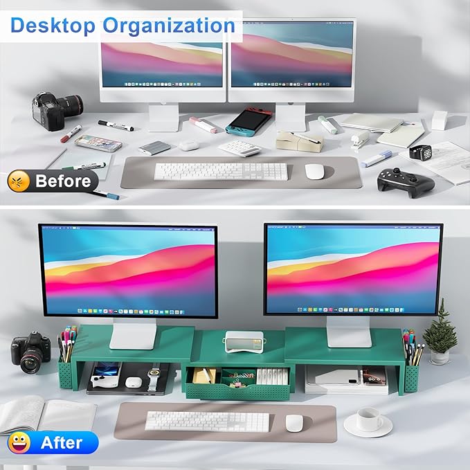 - 【Ample Storage Space】The dual monitor stand features two magnetic pen holders and a drawer, allowing you to easily organize your desk accessories and office supplies, keeping your workspace clear and tidy for easier access.