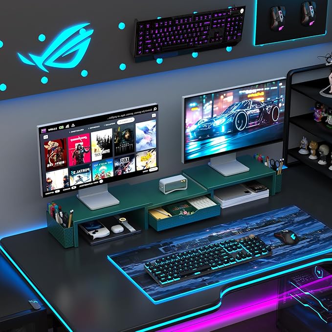 gianotter Dual Monitor Stand Riser, Desk Organizer With Drawer and 2 Pen Holders, Monitor Stand for Desk, Office Decor Essentials (Green)