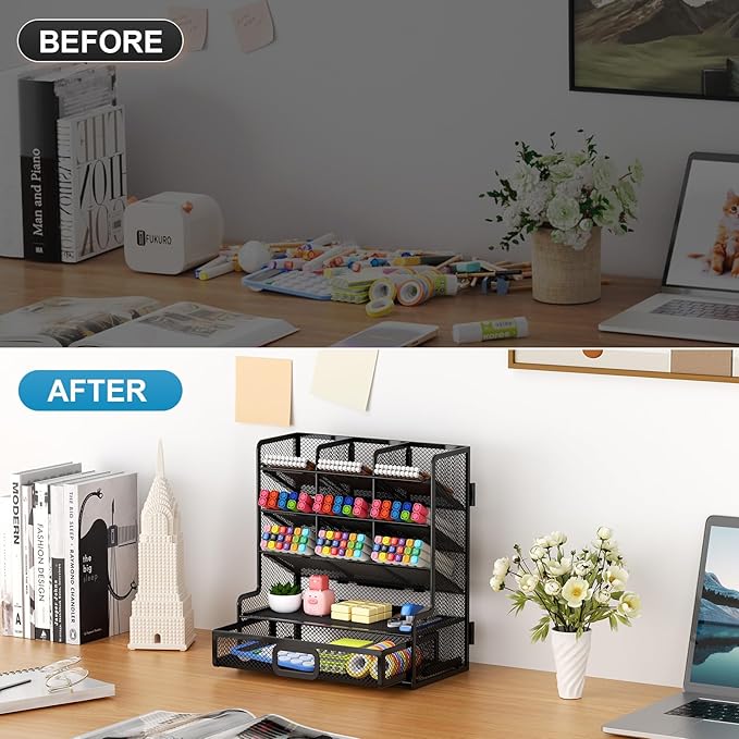 Marbrasse Larger Mesh Desk Organizer with Drawer, Multi-Functional Pen Pencil Holder, Easy Assembly, Desk Organizers and Accessories for Office Art Supplies (Black)