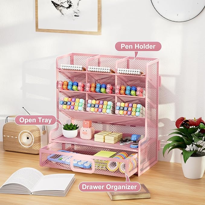 Marbrasse Larger Mesh Desk Organizer with Drawer, Multi-Functional Pen Pencil Holder, Easy Assembly, Desk Organizers and Accessories for Office Art Supplies (Pink)