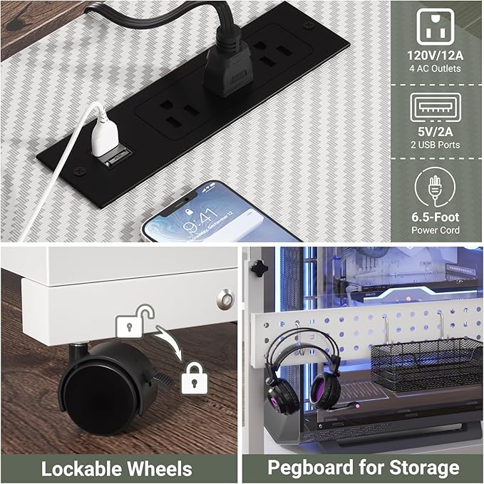 - CPU Holder with Outlets - Built-in useful electrical power outlets and USB ports (3 AC outlets + 2 USB charging ports) for your devices to plug in. It is handy and easier to plug in your computer tower, phone, iPad, or PC monitor. So you can keep cables better controlled.