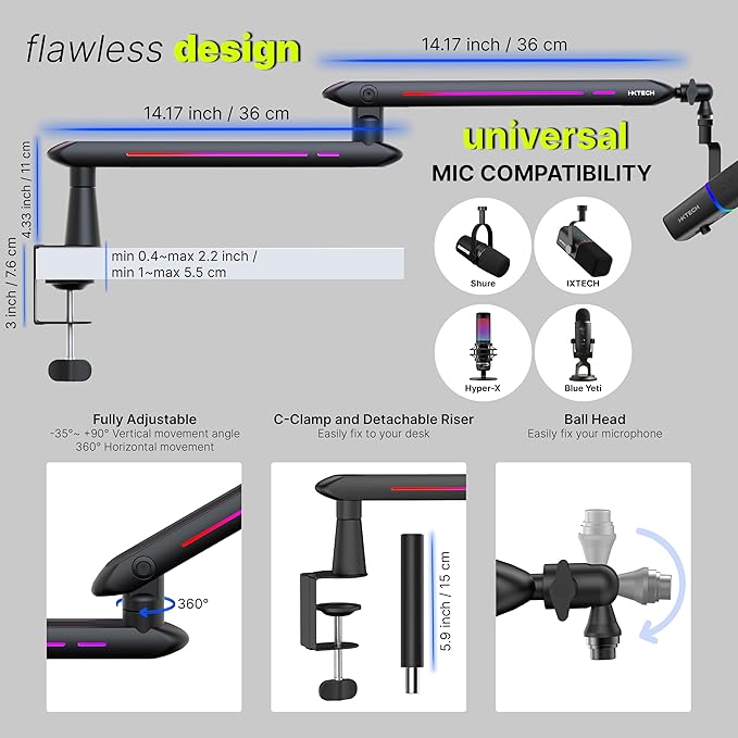 IXTECH RGB Low Profile Boom Arm for Mic, Adjustable Microphone Arm Stand with Desk Mount Clamp, Rotatable Microphone Boom Arm Mic Stand with Cable Management for Podcast Streaming Gaming Studio.