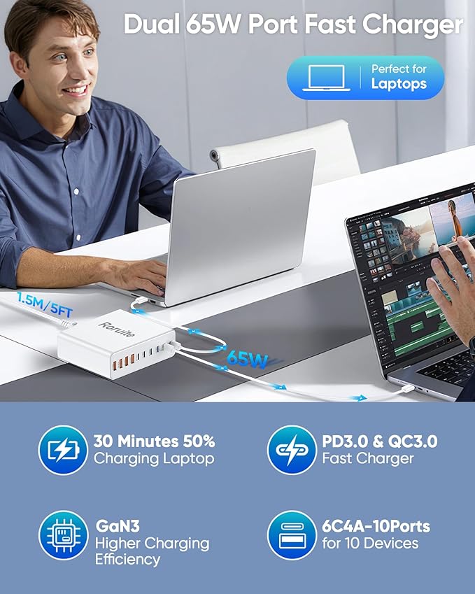 - 【6 Layers of Safety Protection】 The Roruite charging station uses advanced GAN III chip technology with built-in protection mechanisms for your devices. It includes 6 layers of safety features such as overheating protection, overvoltage protection, overcurrent protection, overload protection, overcharge protection, and short-circuit protection. This ensures your devices are charged safely and efficiently, providing peace of mind while you power up your electronics.
