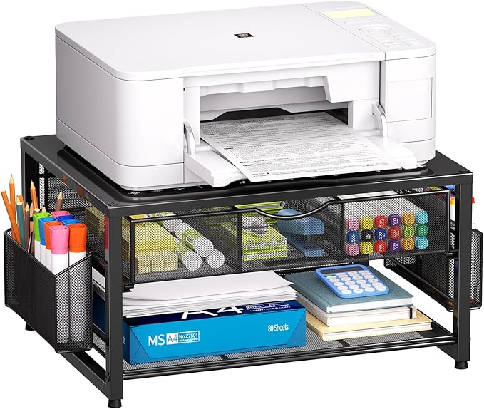 - 【Upgrade Printer Stand】This desk stand features a metal frame, 1 drawer organizer,1 paper letter tray, and 2 hanging pen holders making the stand an ideal choice for managing a desktop. Multifunction helps you not only save printer space but also manage the desk gadgets and stationery clean and tidy.