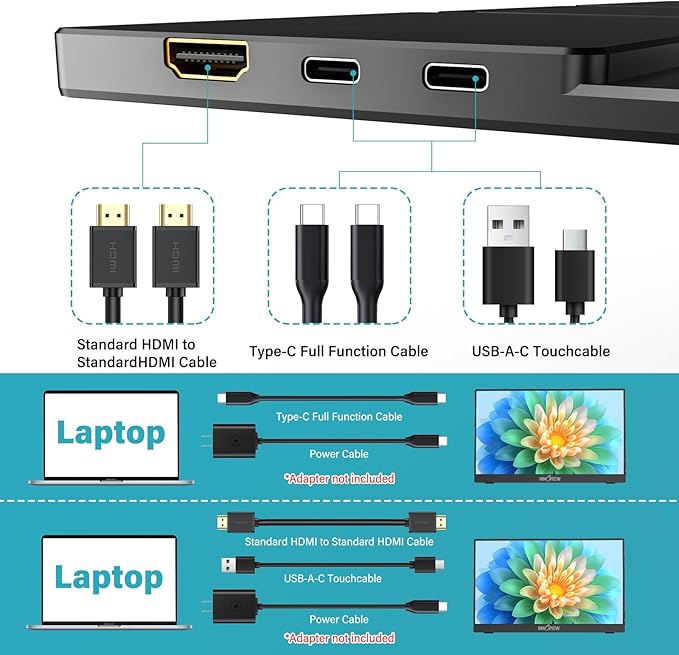 - [10-Point Touchscreen Portable Monitor]: Portable screen compatible with Windows and MacOS systems. You can get touch function for your laptop by connecting via single full-featured Type-C interface and power cable. ππππ: For Type-C 3.1 DP ALT-MODE or Thunderbolt 3/4 ports, please use the included USB-C to USB-C cable for power, video and touch. For devices without these ports, please use HDMI+power cable+USB-A to USB-C cable(If not connected, there is no touch functionality)