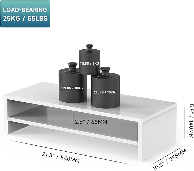 - 【Anti-slip Legs for Stable Stand】The laptop monitor stand is made of 15mm MDF for a beautiful appearance and easy to keep clean. Rubber skids on the bottom of the legs prevent the stand from sliding freely. Tough enough for printers, laptop, desktop or any other type of heavy equipment.