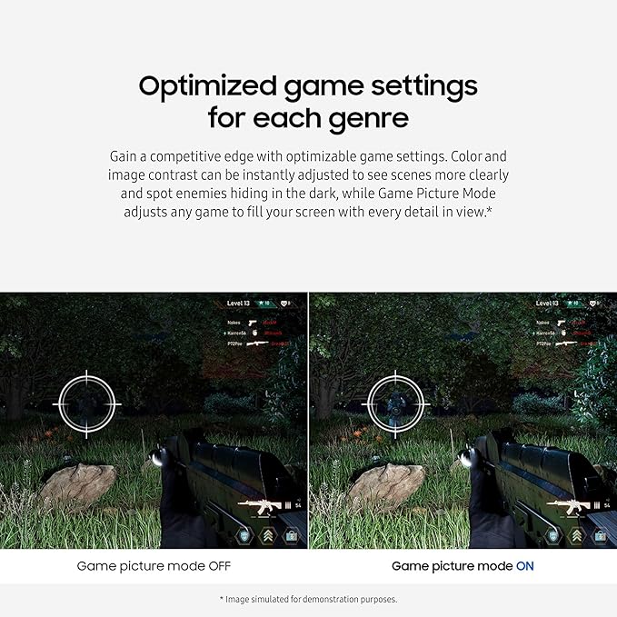 - OPTIMIZED GAME SETTINGS FOR EACH GENRE: Gain a competitive edge with optimizable game settings. Color and image contrast can be adjusted to see scenes more clearly, while Game Picture Mode adjusts any game to fill your screen with every detail in view.**