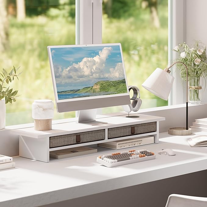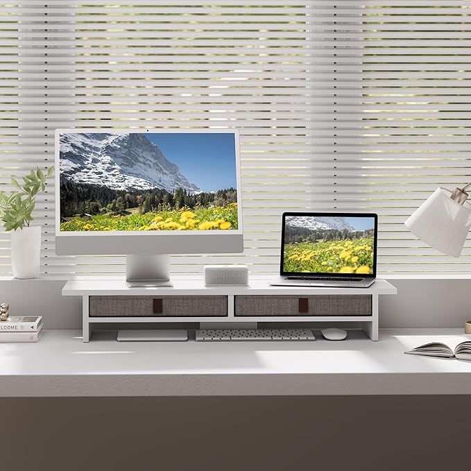 - 【Extra Large Workstation】Equipped with 2 fabric drawers, this monitor stand effortlessly organizes cables, stationery, or office supplies, maximizing desk space while protecting privacy. The 2-tiers structure (35"x9.3") securely holds dual monitors, printers, or TVs, transforming cluttered desks into streamlined workstations.