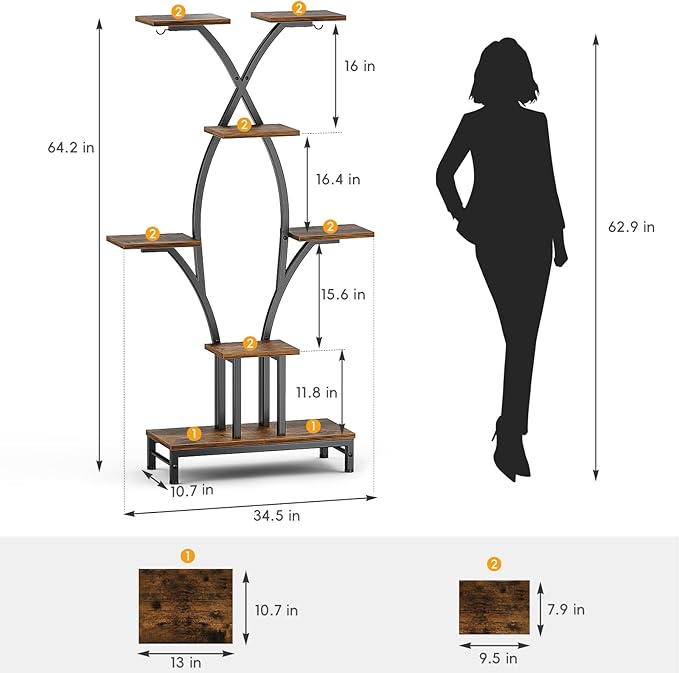 - [ 7-Tier, 63" Tall ] 63" tall plant stand with 7 tiers, 7 pot stands, and 2 hooks for hanging plants. Space-saving X-shape fits corners, adding style and functionality to your home decor