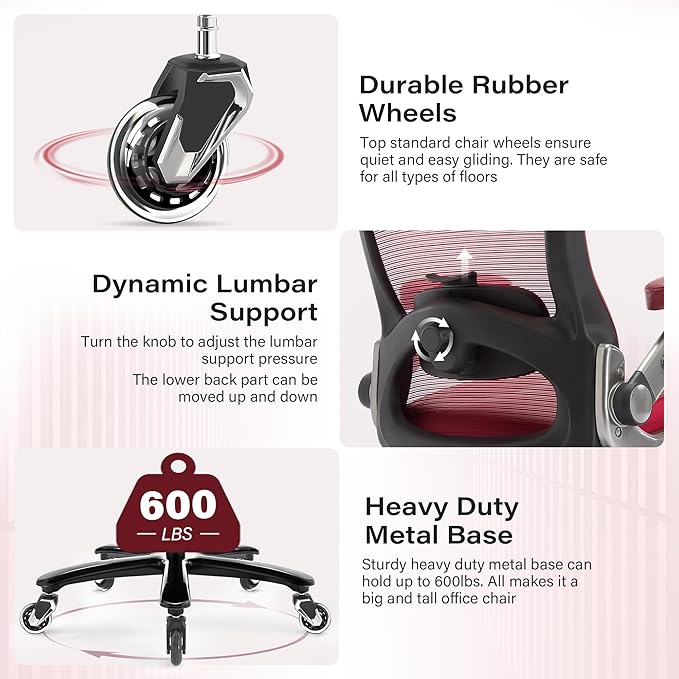 - 【ULTIMATE ERGONOMIC OFFICE CHAIR】Specifically designed for large man, featuring an expansive seat cushion measuring 22.4’’ deep, 26’’ wide, and 6.3’’ thick, alongside a high backrest that stands at 35’’ tall and 23.6’’ wide, capable of supporting up to 600 pounds. This executive computer chair is built on a robust metal base and includes adjustable flip-up 3D armrests, a headrest, and lumbar support. Every aspect of this mesh big and tall desk chair has been meticulously designed to cater to your unique requirement
